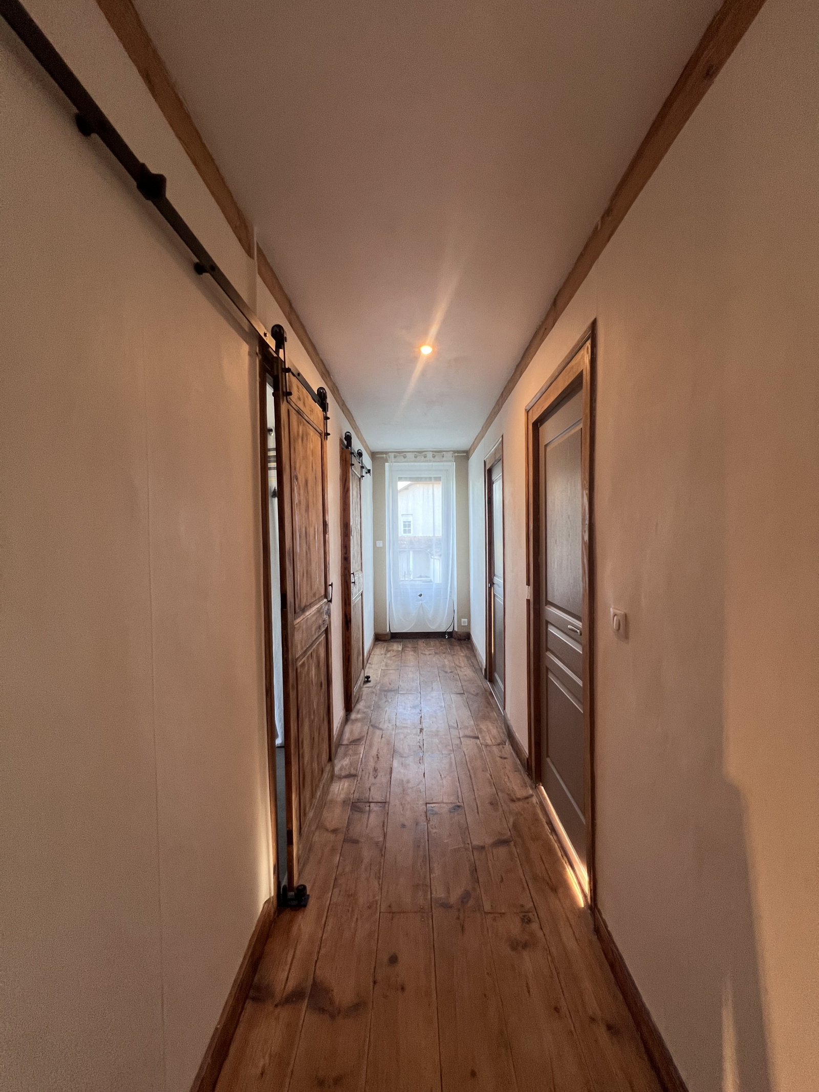D'une surface de 135m², à la décoration soignée, elle est constituée d'un séjour avec poele, ouvert sur cuisine, un bureau, 2 salles d'eau, 4 chambres et un bureau.