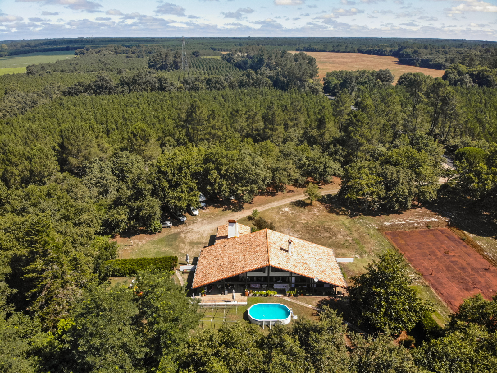 Les grands espaces verts équipés d'un court de tennis en terre battue et d'une piscine hors sol font de cet endroit le lieu idéal pour installer votre famille, recevoir vos amis ou en faire une magnifique maison d'hôtes.